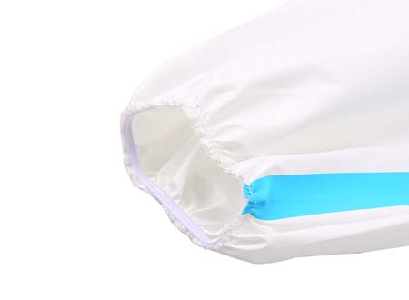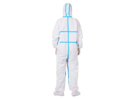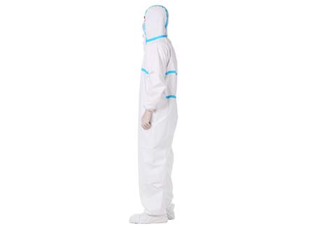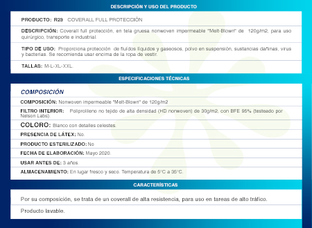 Coverall full protección, en tela gruesa nonwoven impermeable "Melt-Blown" de 120g/m2, para uso quirúrgico, transporte e industrial. Proporciona protección de fluídos líquidos y gaseosos, polvo en suspensión, sustancias dañinas, virus y bacterias. Se recomienda usar encima de la ropa de vestir.