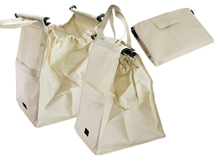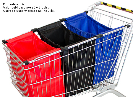 Bolsa reutilizable de tela no tejida (TNT) super-resistente de 120g/m2. Cuenta con 2 asas de 40cm. c/u aprox. Contiene 2 soportes plásticos rígidos negros, para enganchar en las paredes laterales de los carros de supermercados tradicionales. Sistema de cierre pestaña con velcro, bolsillo lateral y frontales superiores elasticados para maximizar la superficie de apertura sobre el carro. 100% plegable para fácil transporte y guardado.