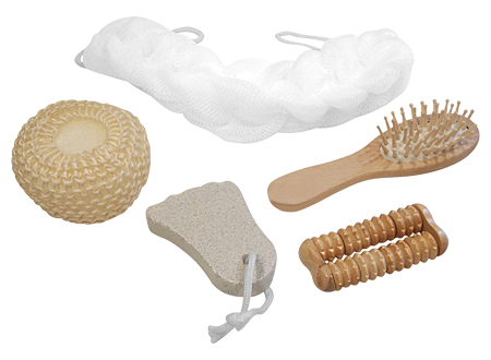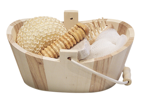 Canasto SPA de belleza en madera modelo "Naturals". Contiene cepillo de pelo, esponja malla, masajeador de madera, piedra pomez y esponja de masaje corporal. FICHA DEL PRODUCTO Tamaño: 17.5 x 12.8 x 8 aprox.