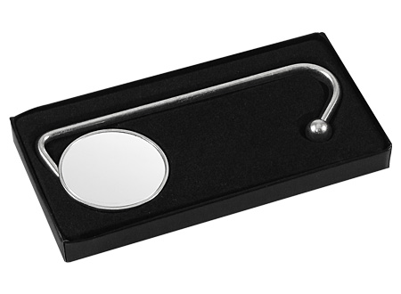 Colgador Metálico de sobremesa para Bolsos y Carteras. Presentación en estuche laminado negro con cuna aterciopelada.