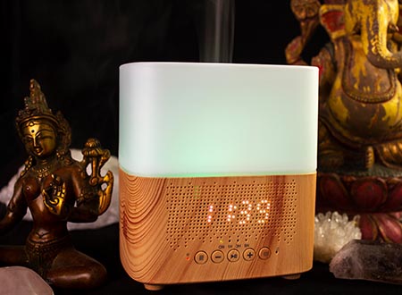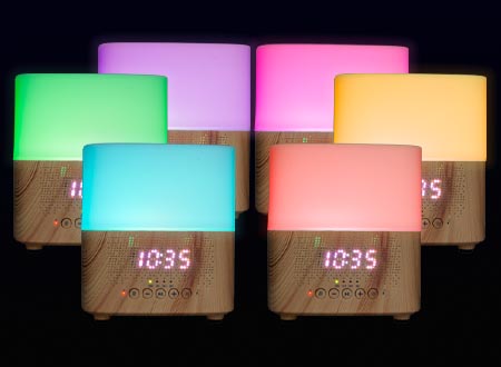 Difusor de Aroma con iluminación, reloj-alarma y parlantes. Contiene conexión Bluetooth para escuchar música desde el celular. Incluye juego de 7 luces LED rotativas de color, o bien se puede fijar cualquier color. Amplio contenido interno para líquido (hasta 300ml). Un producto para disfrutar y relajarse, que no puede faltar en tu hogar u oficina.