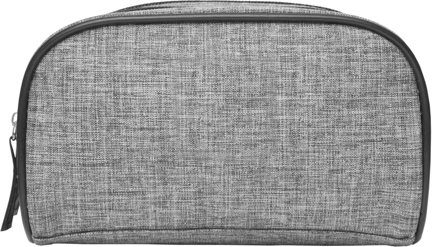 19 x 10 x 9,5 cm. Polyester. Necessaire de dos compartimientos, división movible sujeta con velcro. Detalles en símil cuero. Interior con forro. Tiradores de cierres de símil cuero.