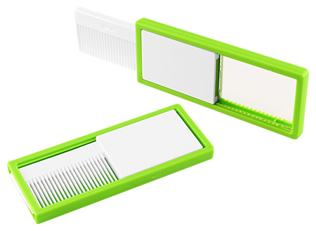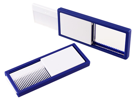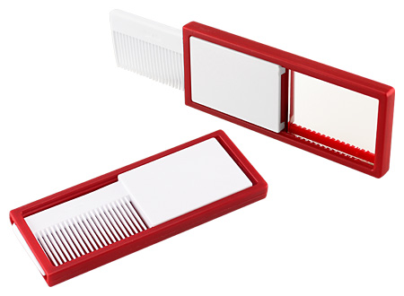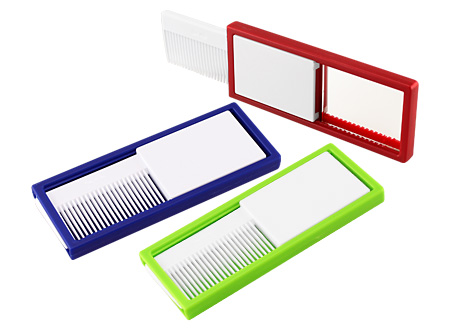 Peine retráctil con Espejo. FICHA DEL PRODUCTO Tamaño: 10 x 4 x 0.8 cm. Colores: Azul (02), Rojo (03), Verde Pistacho (45).