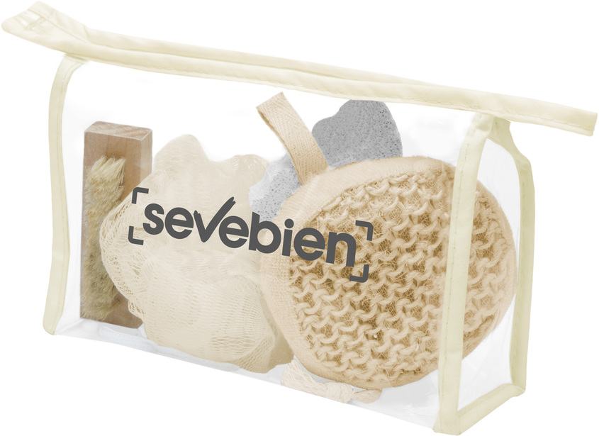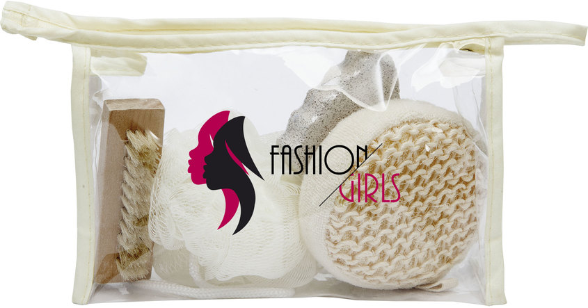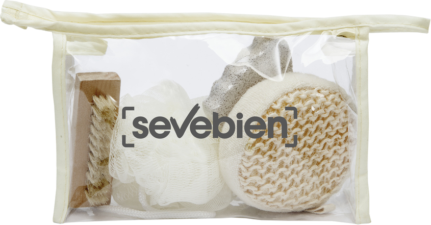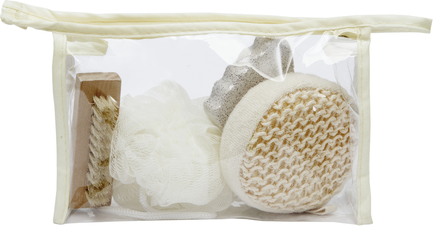 18,5 x 12 x 5 cm. Plástico. Set con 2 esponjas una es exfoliante, piedra/lima y cepillo para uñas.