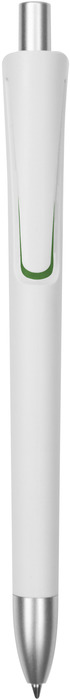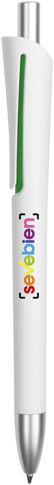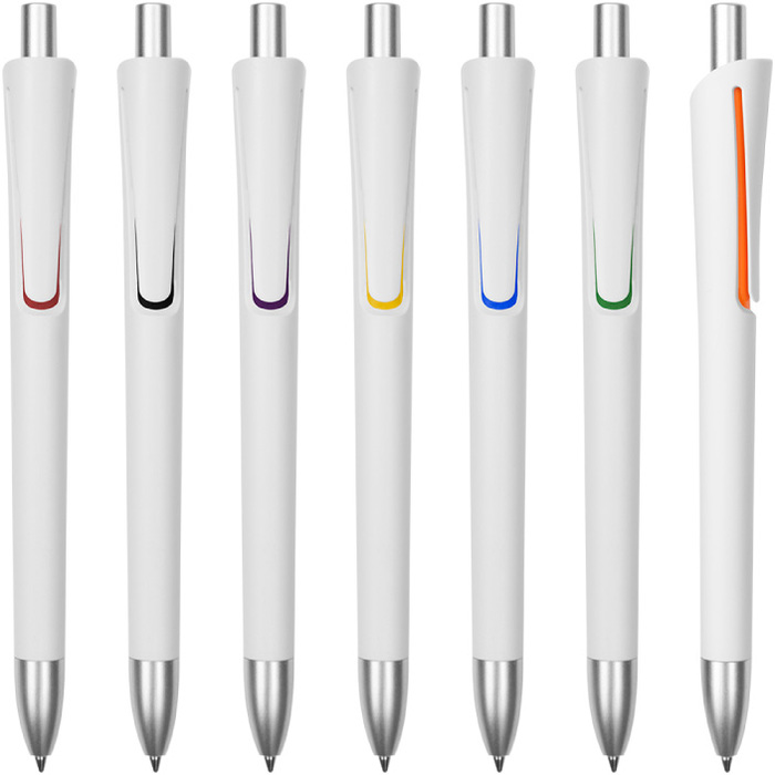 Plástico. Cuerpo blanco mate. Clip, punta y pulsador color plata. Debajo del clip detalle de color. Tinta azul.