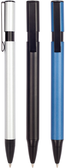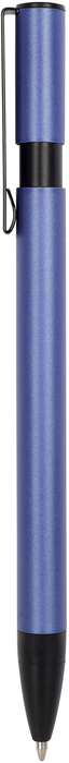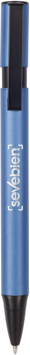 Metal. Formato ovalado. Cuerpo de color. Puntera, clip y pulsador de plástico negro. Tinta azul.