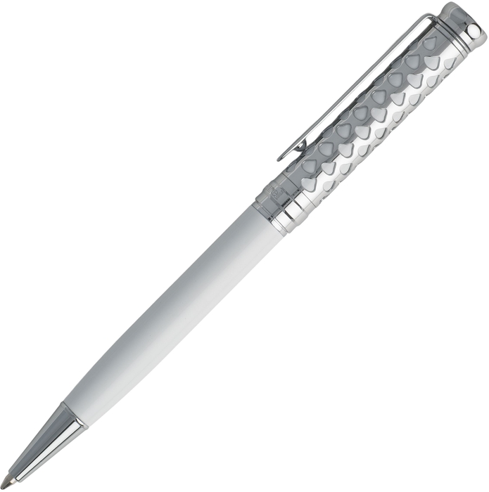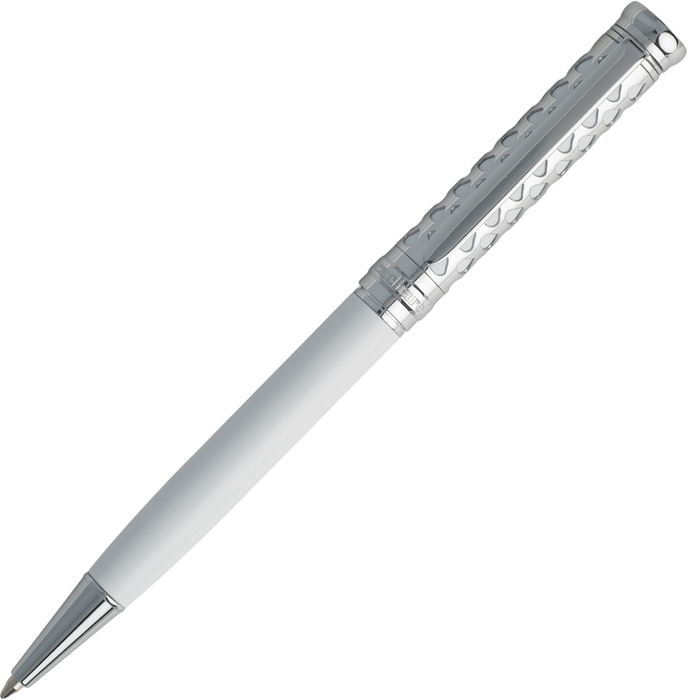 Cuerpo elaborado en resina color blanca con motivos calados en metal cromado. Tinta Azul.