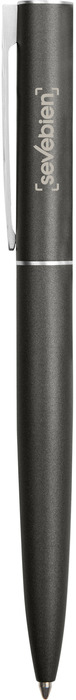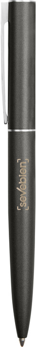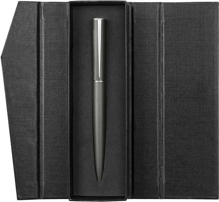 Metálico. Cuerpo color mate. Clip y anillo de acero. Apertura giratoria. Parte superior destapa acero. Parte inferior destapa latón. Estuche de cartón. Tinta negra. Presentación en caja de regalo.