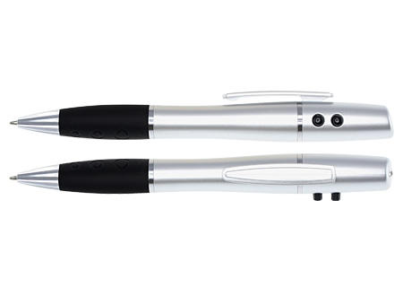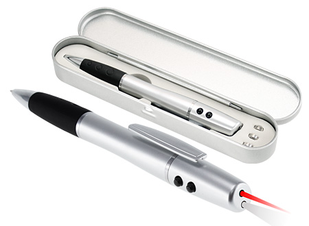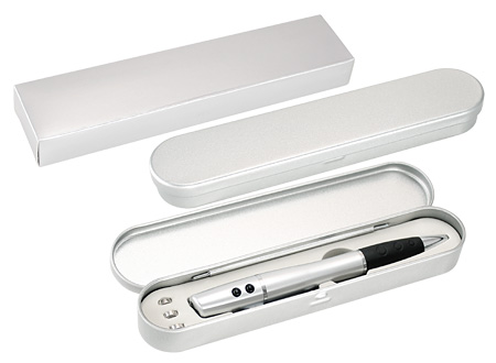 Bolígrafo plástico multi-función 3 en 1. Incluye bolígrafo, linterna LED y puntero láser. Escritura negra. Presentación en estuche metálico y caja plateada de cartón.
