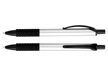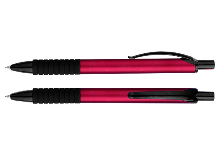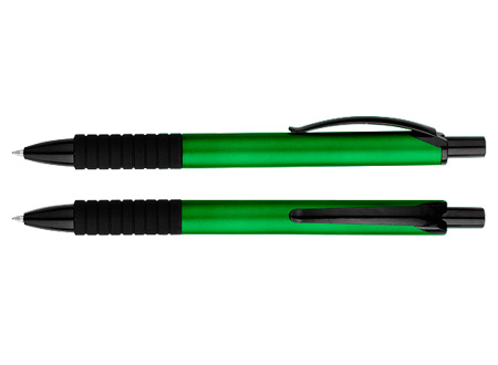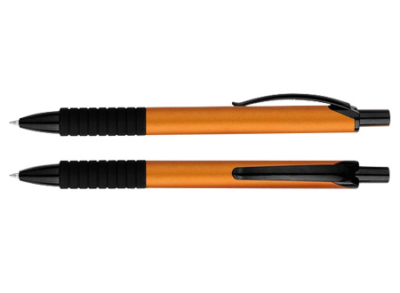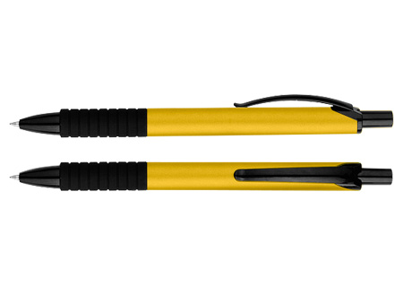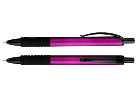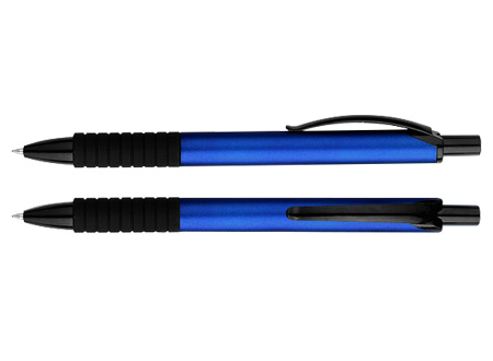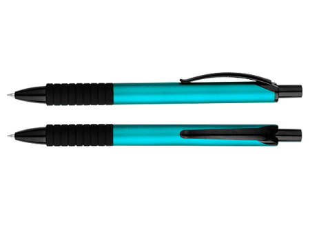 Bolígrafo "Vulcano" con cuerpo de color metalizado opaco y terminales negros. Escritura azul.