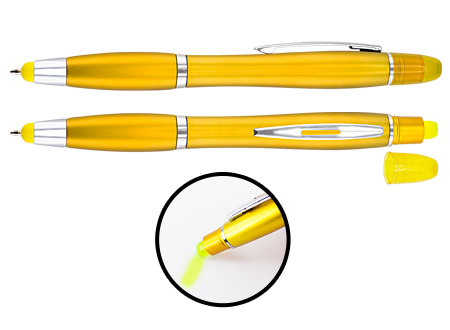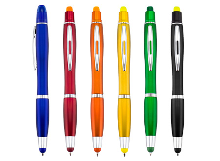 Bolígrafo plástico con cuerpo de color y puntero screen-touch al tono. Incluye práctico destacador (resaltador) de cera de color. Escritura azul.
