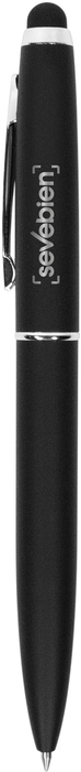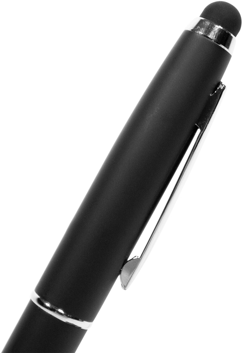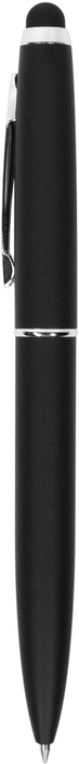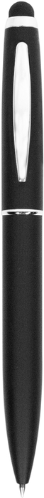 Metal. Cuerpo color negro engomado. Puntera touch y apertura giratoria. Cuenta con detalles color plata. Tinta negra. Decapa plata. Presentación en caja de regalo.