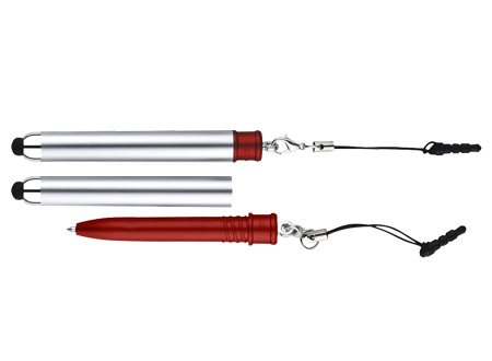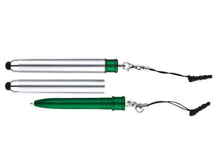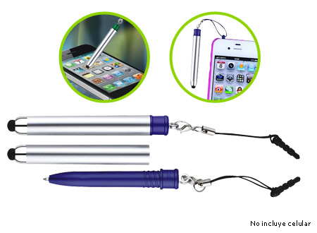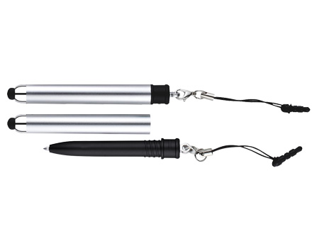 Bolígrafo "Touch-Screen" con tapa plateada y goma posterior negra para pantalla táctil. Incluye práctico soporte plástico para insertar en la salida de auricular del iPhone. Escritura azul.