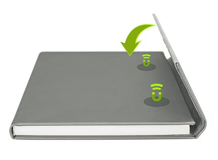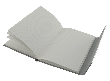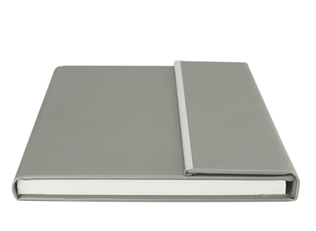 Cuaderno tamaño A5, cubierta de Termo-PU gris, con cierre traslape magnético y banda metálica plateada. Interior 80 hojas lineadas amarillas de 80gsm. Presentación individual en bolsa de polipropileno.