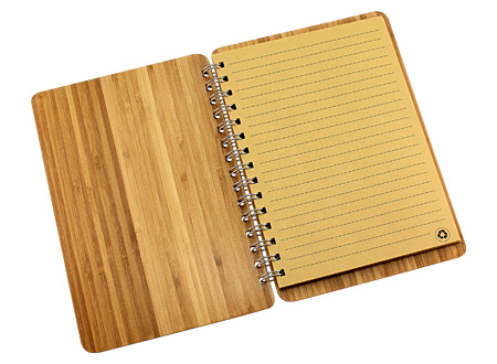 Cuaderno Ecológico con Tapas duras punta redondeada 100% de madera de Bamboo de 3mm de espesor, interior 70 hojas lineadas interiores de papel kraft reciclado de 14.3 x 20 cm y anillado metálico doble cero.
