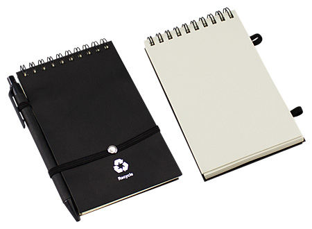 Libreta Ecológica con tapas de cartón reciclado, 70 hojas interiores blancas (croqueras). Incluye cierre elasticado y bolígrafo ecológico. FICHA DEL PRODUCTO Tamaño: 8.8 x 13.8 x 0.8 cm. Colores: Negro (08).