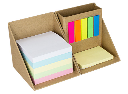 Memo set Ecológico retráctil con forma de Cubo en Cartón. Incluye 500 hojas de notas cuadradas de colores, 50 notas adhesivas amarillas medianas, 125 banderitas adhesivas de colores y un compartimento porta-lápices.