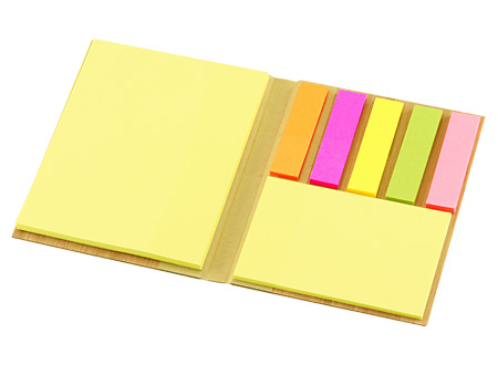 Memo Set con Tapas Duras enchapadas en madera de Bamboo. Incluye 50 notas adhesivas amarillas grandes, 25 notas adhesivas amarillas medianas y 125 banderitas adhesivas de colores.