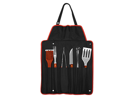 Delantal de tela raquelada negra con 9 prácticas herramientas para asado. Plegable y transformable en bolso. Fácil para bordar o imprimir. FICHA DEL PRODUCTO Tamaño: 44 x 69 cm. (desplegado). Colores: Negro (08).