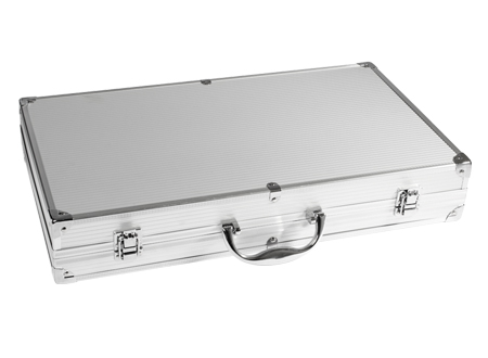 Deluxe BBQ set de asado en caja metálica. Incluye 24 herramientas de asado 100% acero inoxidable. Interior recubierto en tela ecológica negra. Manilla y cierres metálicos. Incluye placa metálica rectangular para grabar logo. Presentación bubble-bag.