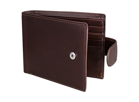 Deluxe Billetera de cuero natural Marrón con broche. Finas terminaciones. 17 compartimentos interiores (3 secciones). Alta resistencia al uso. Presentación en bolsa frozen y caja de cartón forrado negro texturado.