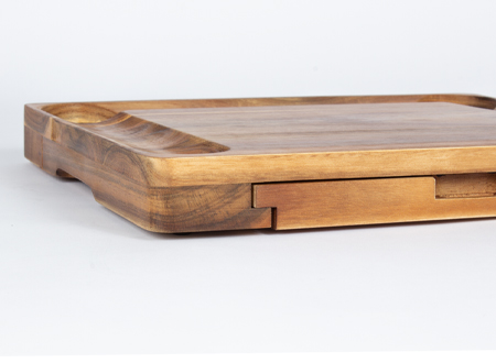 Espectacular tabla de madera sólida de ACACIA, con doble canal para picoteo, gran espacio central para quesos. Contiene 3 posillos de loza blanca para salsas + 6 cuchillos para cortar quesos + 6 tenedores pinchos de queso, de Acero inoxidable , en 2 compartimentos inferiores retráctiles. Madera trabajada y acabada en máquina, de forma 100% regular, con superficies y cantos lisos y suaves, para una mayor higiene y comodidad al momento de cortar y servir los quesos.