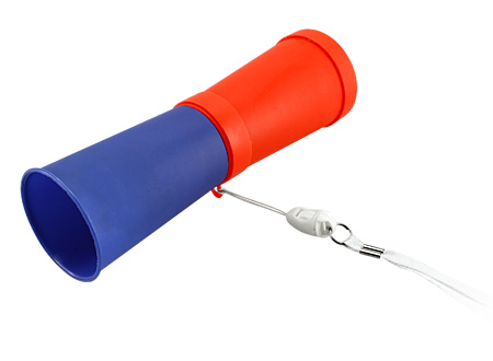 Vuvuzela con lanyard para colgar. Presentación en bolsa transparente y cartón impreso con troquel, para exhibición en ganchera.
