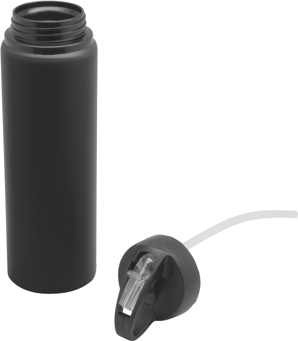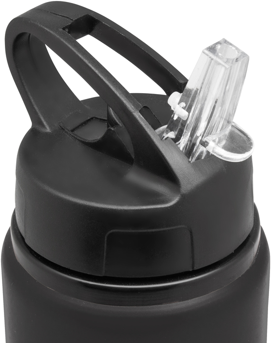 Ø 7 x 25 cm. Capacidad 800 ml. Botella de aluminio con manija de agarre en la tapa, sorbete plástico y boquilla rebatible. Tapa a rosca plástica color negro. Presentación en caja de regalo.