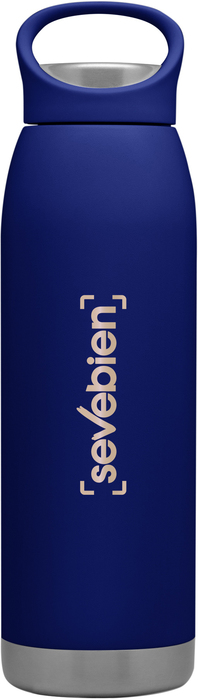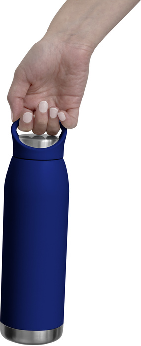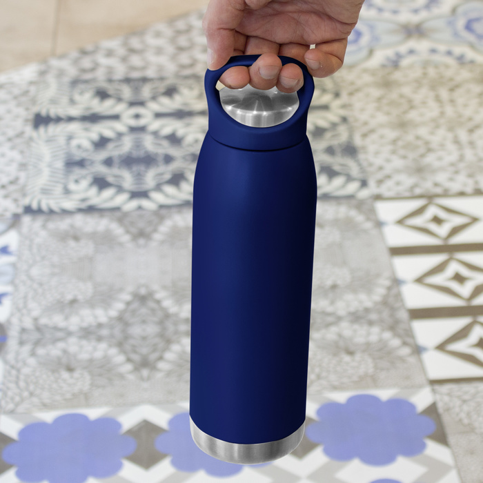 Ø 7,6 x 26,5 cm. Capacidad 600 ml. Acero inoxidable. Botella doble pared, sellada al vacío. Interior en acero 304 y exterior en acero 201. Pintura en colores mate. Tapa combinada en plástico del mismo color de la botella y acero inoxidable 201. Mantiene hasta 12 hs la temperatura de las bebidas calientes y 24 hs de las bebidas frías.  Presentación en caja de regalo.
