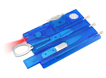 Card Tool 9 funciones con Luz Roja. Tamaño tarjeta de crédito. Incluye Bolígrafo, Mondadientes, Pinzas, Lupa, Set de Destornilladores, Tijeras, Cuchillo, Regla 7cm y Linterna con Luz Roja.
