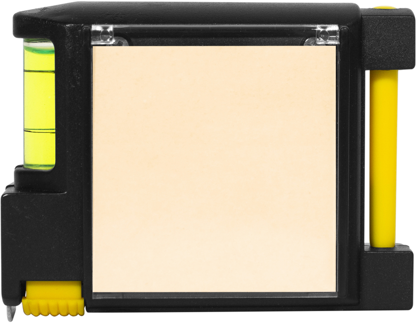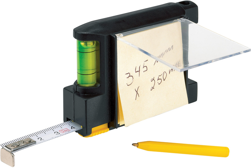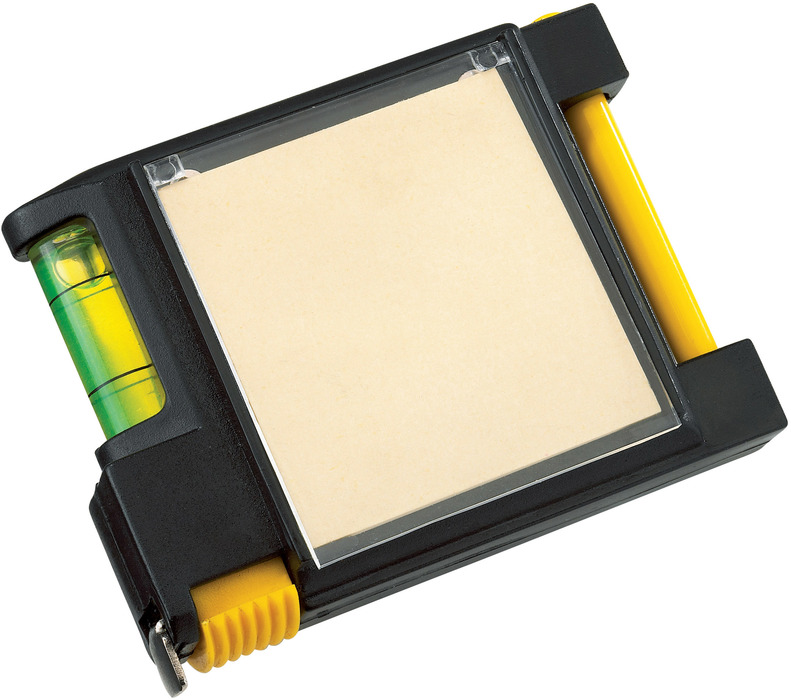 7,9 x 6 x 2,4 cm. Plástico. Huincha de medir con nivel, notas adhesivas, bolígrafo y centimetro aprox. 2m. Presentación en caja de regalo.