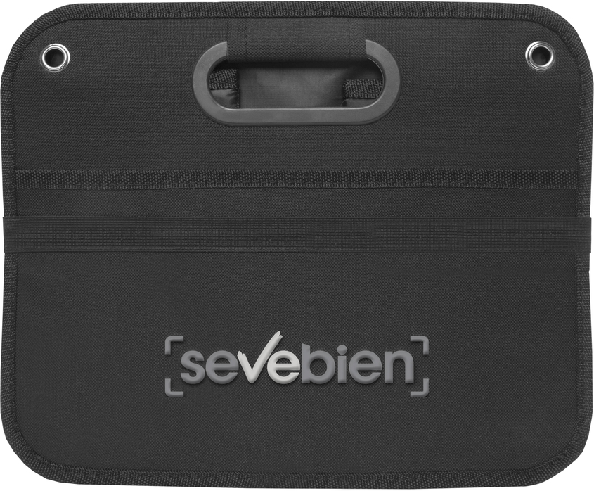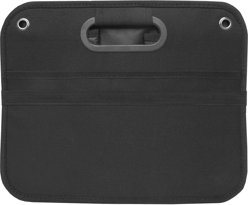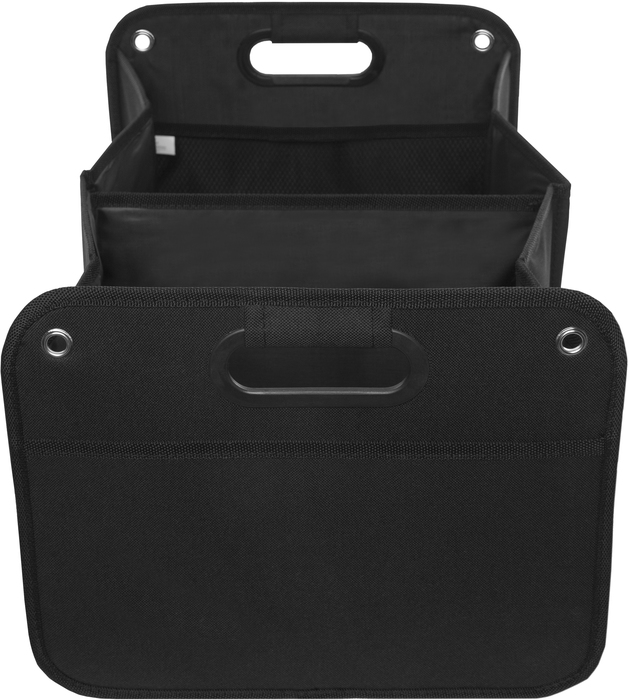 51 x 26,5 x 32,5 cm. (abierto). 5 x 26,5 x 32,5 cm (cerrado). Polyester 600D. Organizador. Dos amplios compartimentos de 25,5 cm (aprox) cada uno con dos estructuras de cartón que permite armar los contenedores. En uno de los compartimentos contiene un bolsillo de red. Manillas/asas recubiertas en plástico. Arandelas metálicas. En la parte inferior contiene velcro que se adhiere a la superficies. Banda elástica que mantiene cerrado el organizador cuando no esta en uso.