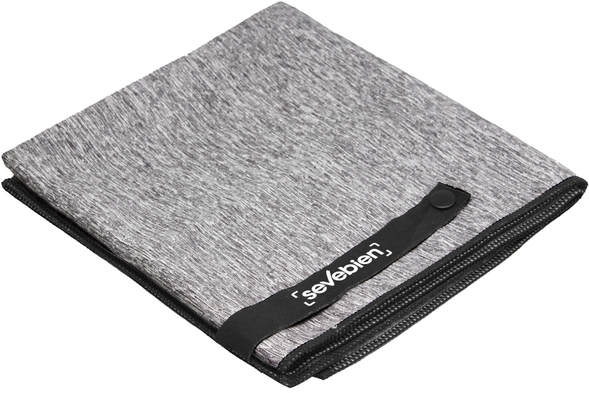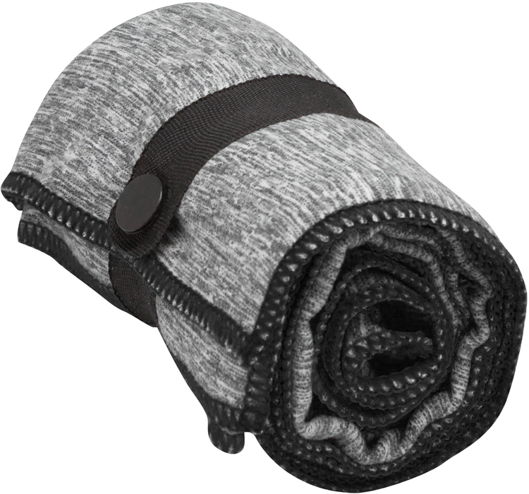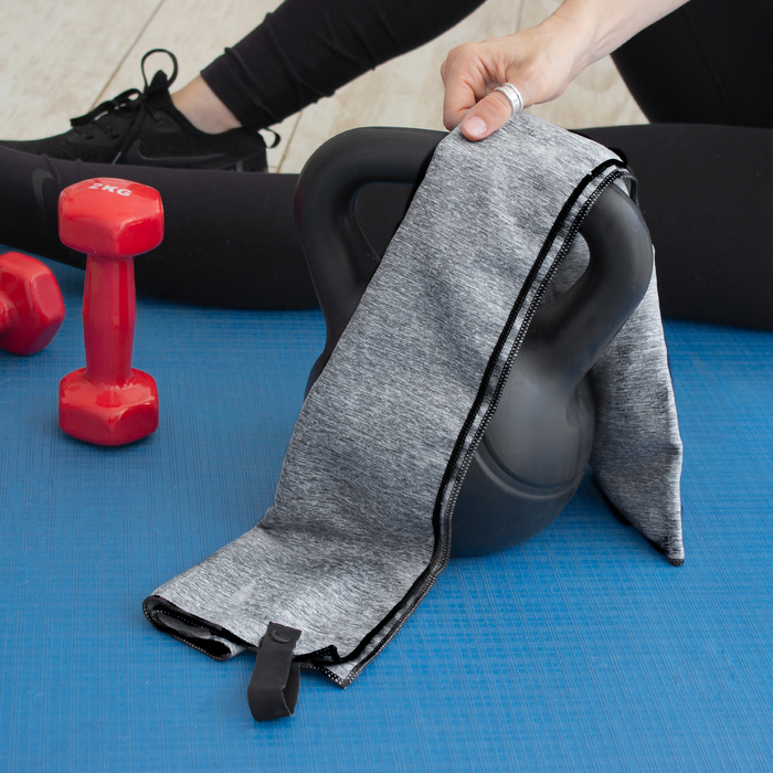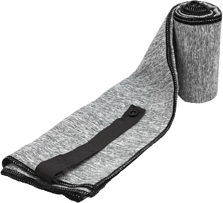 80 x 40 cm. Microfibra. Toalla de microfibra de secado rápido. Cinta negra que permite enrollar la toalla y aplicar logo.