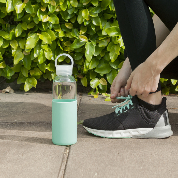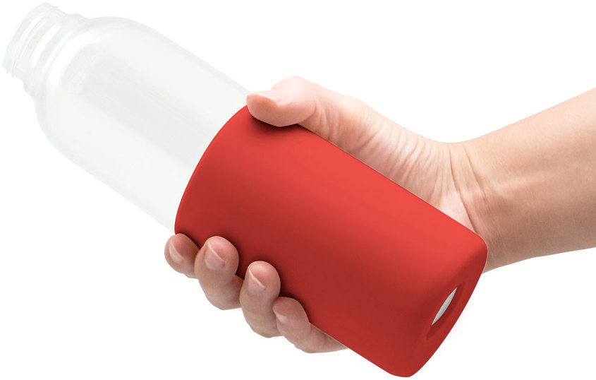 Ø 6,5 x 24 cm. Capacidad 500 ml. Vidrio de borosilicato. Botella práctica y reutilizable. Posee manga de silicona antideslizante en varios colores y pico ancho. Tapa a rosca, antiderrame y con manija de agarre. Presentación en caja de regalo.