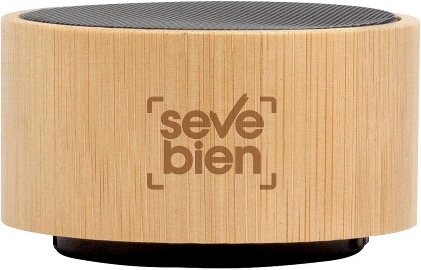 Ø7,5 x 4 cm. Parlante Bluetooth. Caja redonda de Bambú color natural con malla metálica en la parte superior. Base negra con panel de control. Permite recibir llamadas. Micrófono incorporado. Versión bluetooth: 5.0. Batería: 300 mAh. Potencia: 3W. Cable de carga y conexión USB tipo C en color negro. Presentación en caja de regalo Kraft.