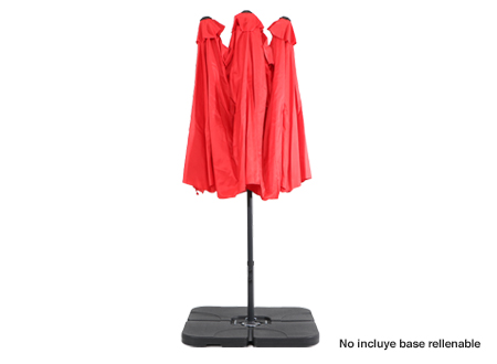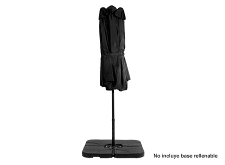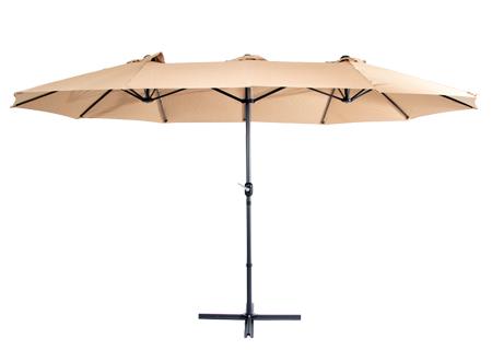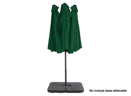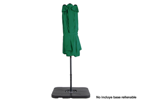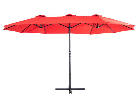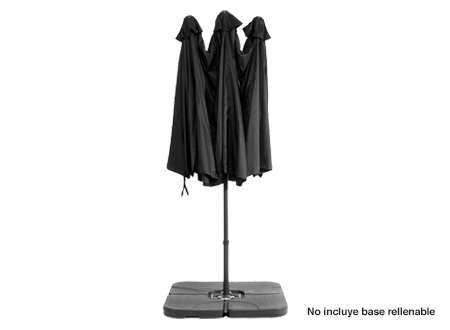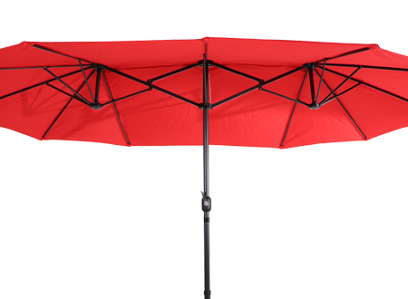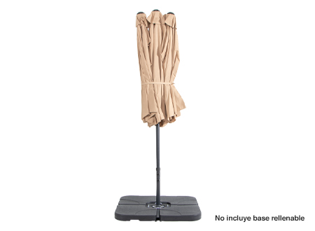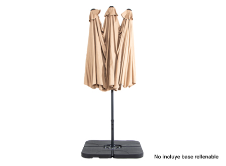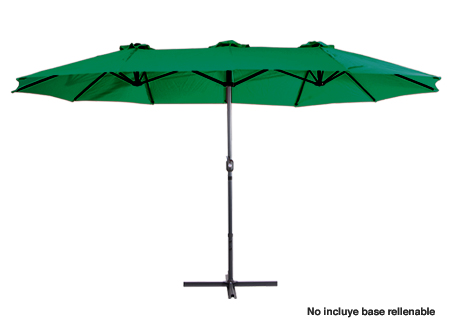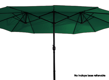 Quitasol ovalado doble de 4.55 x 2.7 m, modelo "Twins", con 12 cascos de lona Poliéster UV impermeable de 180g. Contiene varas reforzadas de Acero recubierto de 12 x 18mm, asta de Acero recubierto de 48mm, sistema de apertura automático con manivela.