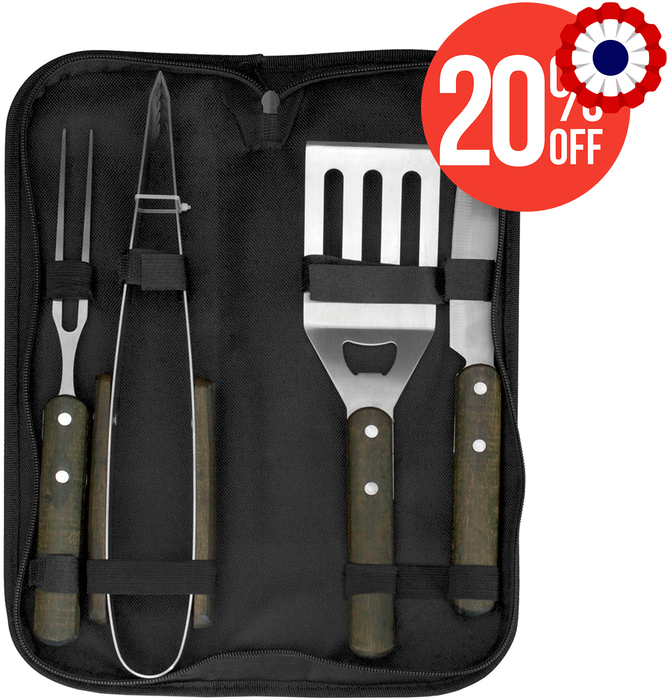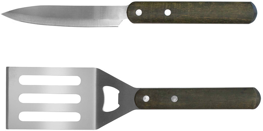 36,5 x 11 x 5,2 cm. (medidas del estuche). 28,9 cm (medida del tenedor parrillero) 33 cm (medida de la pinza). 28 cm (medida de la espatula). 29 cm. (medida del cuchillo con protección plástica). Madera y acero inoxidable. Estuche con mangos que contiene accesorios para la parrilla: tenedor parrillero-Pinza para servir-cuchillo y espatula.