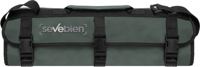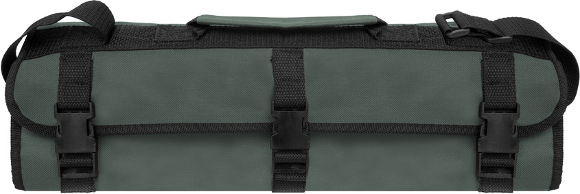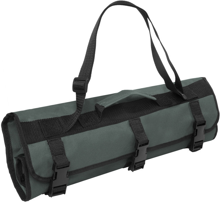 Ø 9 x 46 cm. (cerrado) 60 x 46 cm. (abierto). Poliester y acero inoxidable. Set para asador cuenta con tenedor asador, cuchilla de acero inoxidable, cepillo de aluminio, espátula, pinza, pincel, 4 pinchos para brochetas y 6 pinchos pequeños. Estuche de polyester con manilla y tres hebillas plásticas para cerrar.