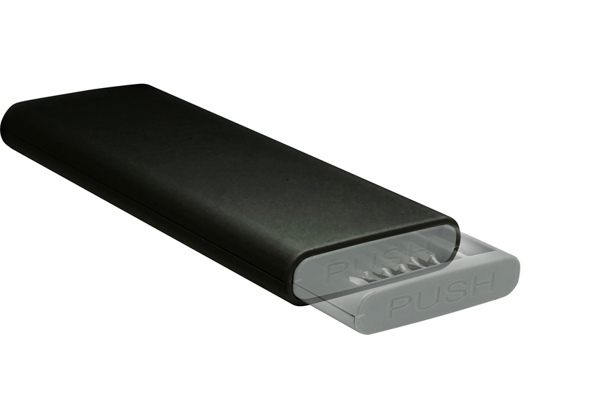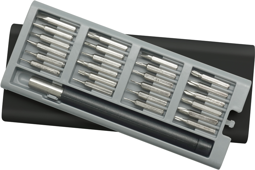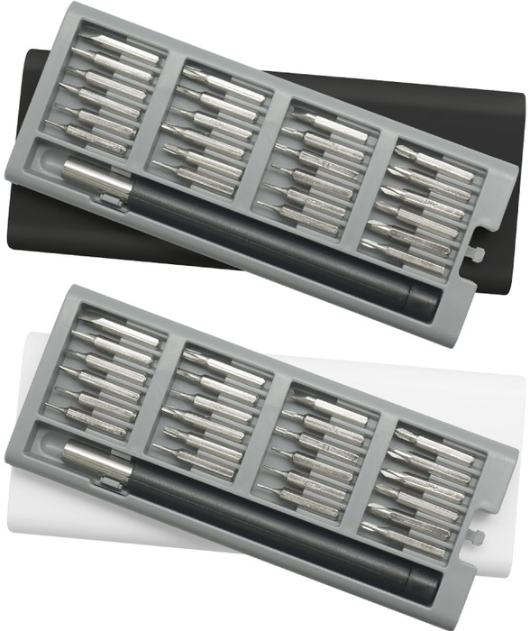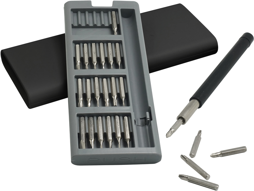 16,5 x 6,8 x 1,8 cm. Plástico y Acero.  Mango con punta imantada con 24 puntas diferentes. La caja viene con cuatro compartimentos imantados que permiten mantener ordenadas las diferentes puntas. La caja contiene apertura push.