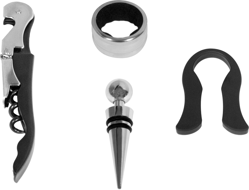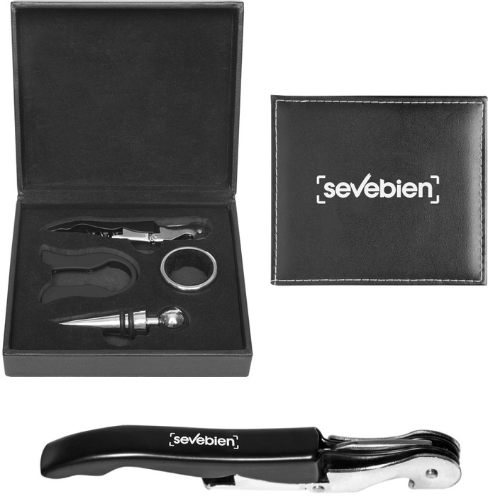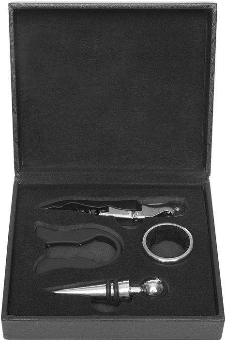 16 x 14 x 5 cm. Simil cuero. Accesorios para vino en estuche de simil cuero. Cuenta con sacacorcho, anillo antigoteo, tapón y corta cápsula. Presentación en caja de regalo.