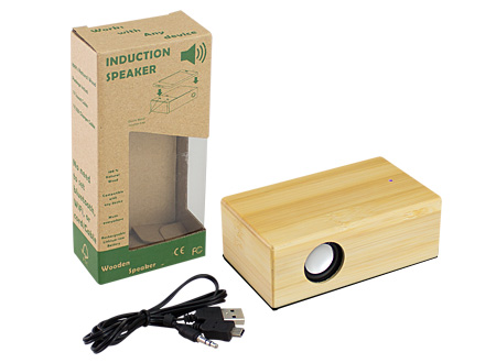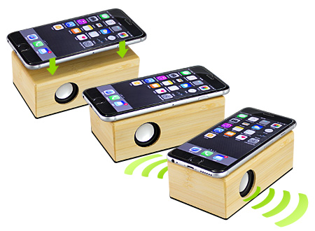 Parlante amplificador de sonido por Inducción, de madera de Bamboo. No necesita Bluetooth, Wi-Fi o conexión a cable. Amplifica el sonido una vez que se posa el celular sobre él, con un efecto de caja de resonancia. Compatible con cualquier modelo de teléfono celular. Contiene batería de ion-litio recargable incorporada. Incluye cable de sonido y cargador USB.