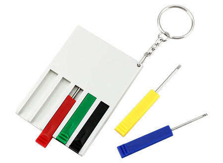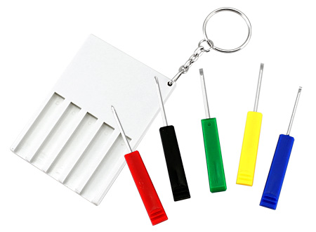 Set de 5 mini-destornilladores de precisión, con llavero. FICHA DEL PRODUCTO Tamaño: 5 x 7 x 0.6 cm. Colores: Blanco (01).