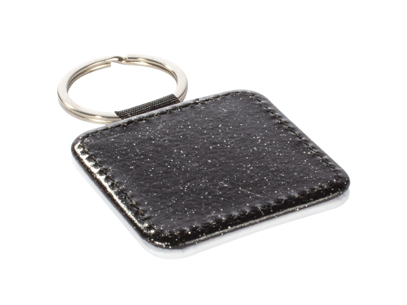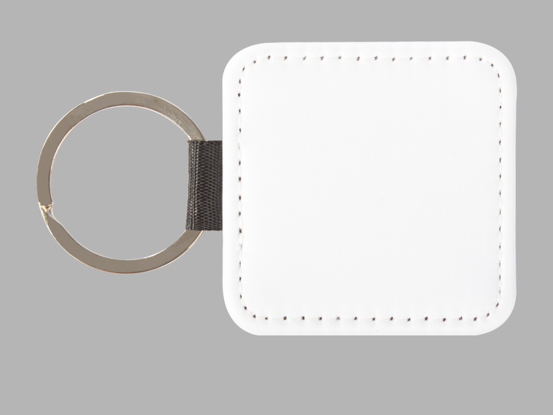 Llavero cuadrado de PU blanco para sublimación. Reverso capa PU negro con brillo (no sublimable). Argolla de Acero inoxidable.