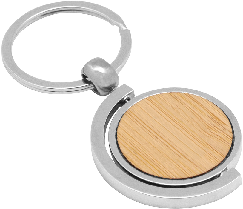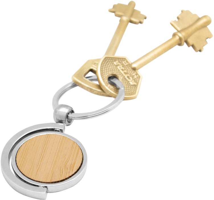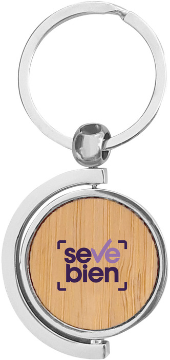 7,5 x 3,5 x 0,4 cm. Llavero circular de bambú con detalles metálicos. Estructura giratoria 360°. Presentación en caja de regalo.