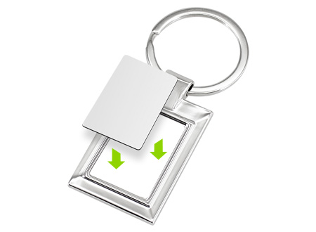 Llavero metálico rectangular, con rectángulo blanco para sublimación. Presentación en estuche laminado negro con cuna aterciopelada.
