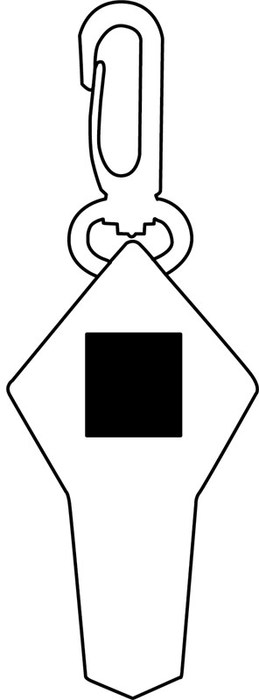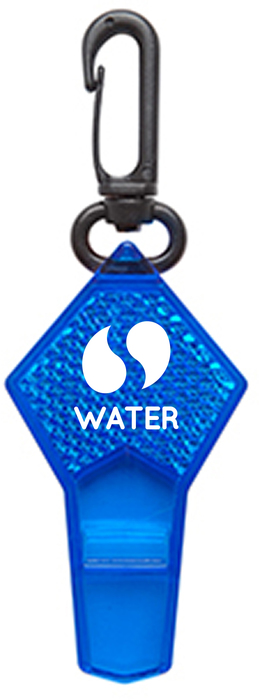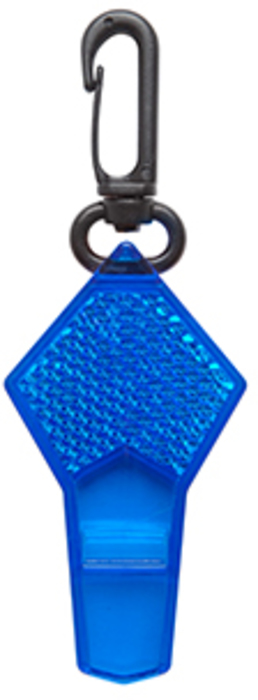 7,5 x 4 cm. Material reflectante. Silbato transparente con formato romboide. Mosquetón color negro.