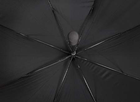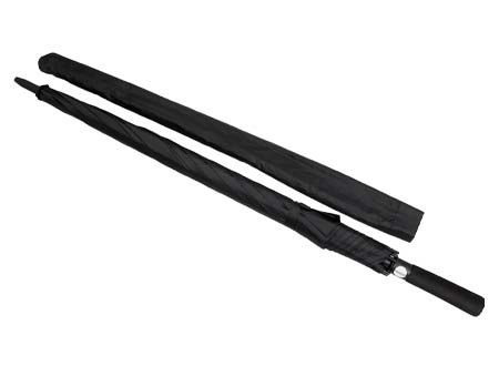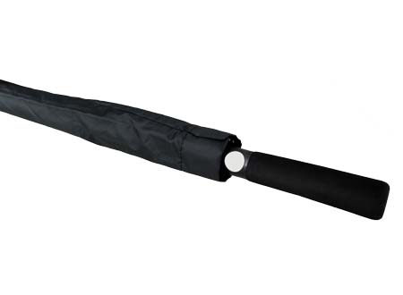 Paraguas ejecutivo gigante, con 8 cascos de tela 190T PONGEE, reverso UV. Contiene varas reforzadas Anti-Vuelco de Fibra de Vidrio color negro y sistema de apertura automático. Mango recto de EVA negro. Incluye funda al tono de 190T PONGEE.