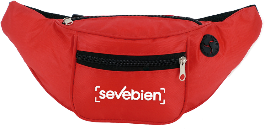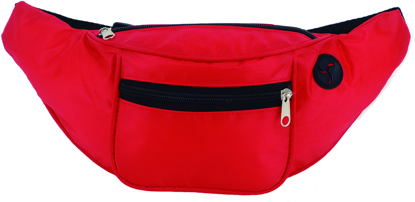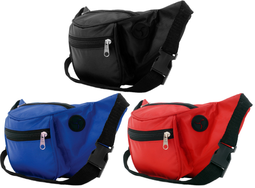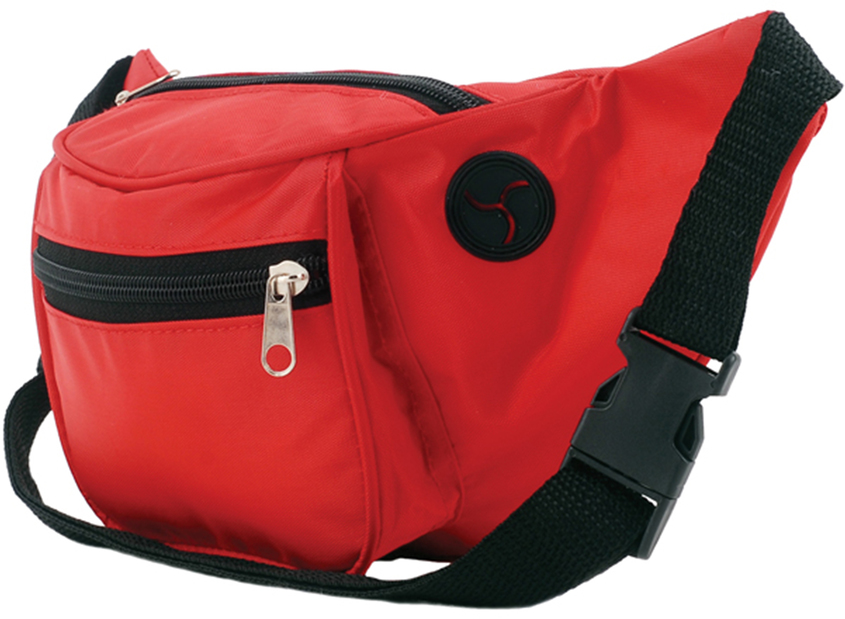 33 x 14,5 cm. Polyester 420D. Cangurera de 2 bolsillos. Salida para audífonos. Correa ajustable con herrajes plásticos. Cierres metálicos.