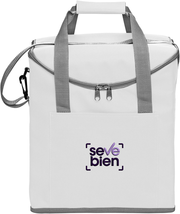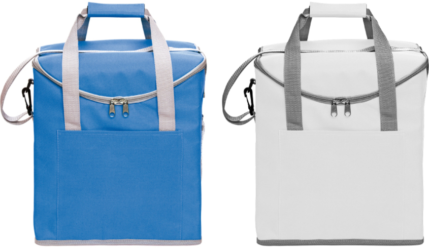 30 x 34 x 19,5 cm. Capacidad 37 litros. Poliéster. 600D Lonchera térmica con recubrimiento interior metalizado. Un bolsillo frontal y dos bolsillos laterales de red. Correa tipo bandolera y dos manijas reforzadas con cierre de velcro. Capacidad hasta 6 botellas de 2,5 litros