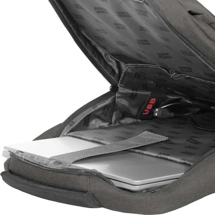 28 x 42 x 12 cm. Polyester Wulong 300D Hidrofugo. Capacidad 14 litros. Compartimento principal con cierre y bolsillo portanotebook para 16¨y bolsillos organizadores de accesorios. Dos bolsillos frontales con cierre y un bolsillo lateral. Puerto USB exterior con conector interior para bateria. Correas ajustables y espalda acolchadas. Tiradores de cierre engomados. Presencia de marca al frente y en su interior.
